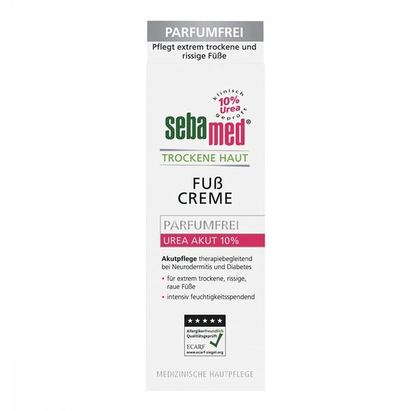 Effects of Sebamed Dry Skin Perfume-Free Foot Cream Urea10% (pack size: 100 ml)Discomfort caused by dry and cracked skin on the feet can be effectively relieved by Sebamed Dry Skin Perfume Free Foot Cream Urea10% (pack size: 100ml). Highly concentrated urea (urea) provides intensive moisture and thus reduces unpleasant itching. In addition, vegetable triglycerides balance the natural moisture content, while panthenol promotes skin regeneration. Vitamin E protects against damaging environmental influences by eliminating free radicals. As a result, you will get supple, smoothed skin. Sebamed Dry Skin Perfume-Free Foot Cream Urea10% (pack size: 100 ml) can also be used as an ideal therapy companion for foot care for eczema, psoriasis and diabetes.