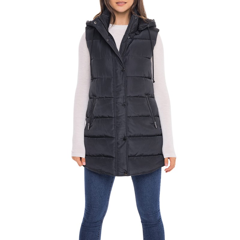 - Outerwear Vest Jacket - Long Fashion sleeveless bubble body with hood is perfect for Fall and Winter. Featuring center front zipper closure and zip up pockets that are sure to keep you hands warm and valuables secure.