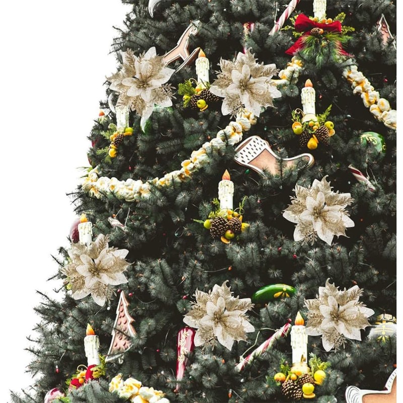 - These Christmas flowers are made of high quality plastic and glitter, safe and durable. These flowers will shine through the festive season. Christmas flowers can be used to decorate Christmas trees, weddings, parties and add a strong festive atmosphere.