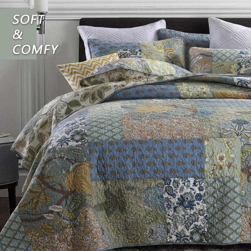 Secgo Queen Quilt Size - 100% Cotton Queen Comforter Set Green Bedding Sets (90 * 98 Inch) with 2 Pillow Shams, Patchwork Reversible Lightweight Bedspread, Quilted Coverlet Fit All-Season