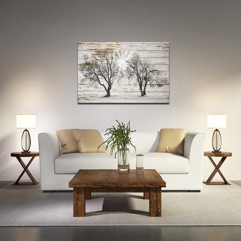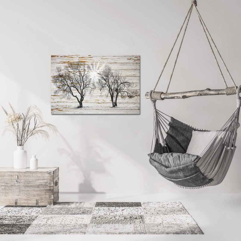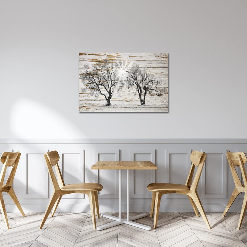 sechars - Black and White Tree in Sunrise on Rustic Wooden Background Canvas Print Winter Landscape Picture Giclee Print on Canvas,Framed and Ready to Hang,Modern Home Ofiice Wall Decor - 24"x36"