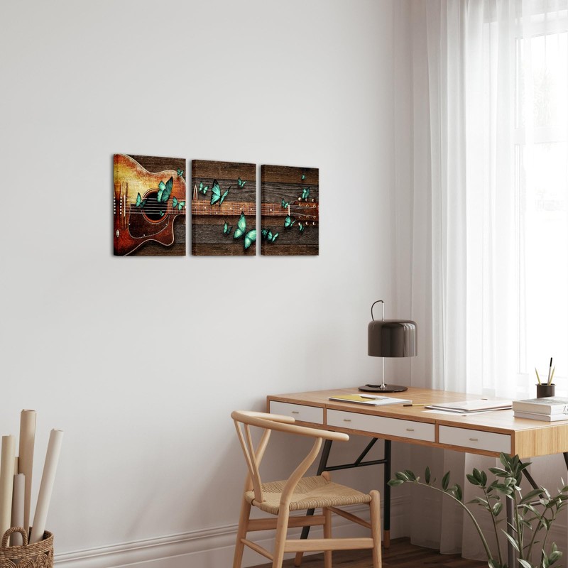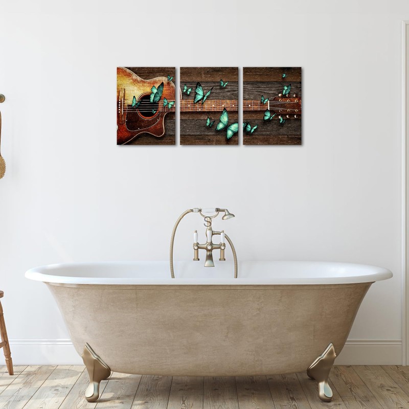 - ARTISTIC DESIGN: Three-piece canvas wall art featuring a vintage guitar with vibrant teal butterflies against a rustic wood background