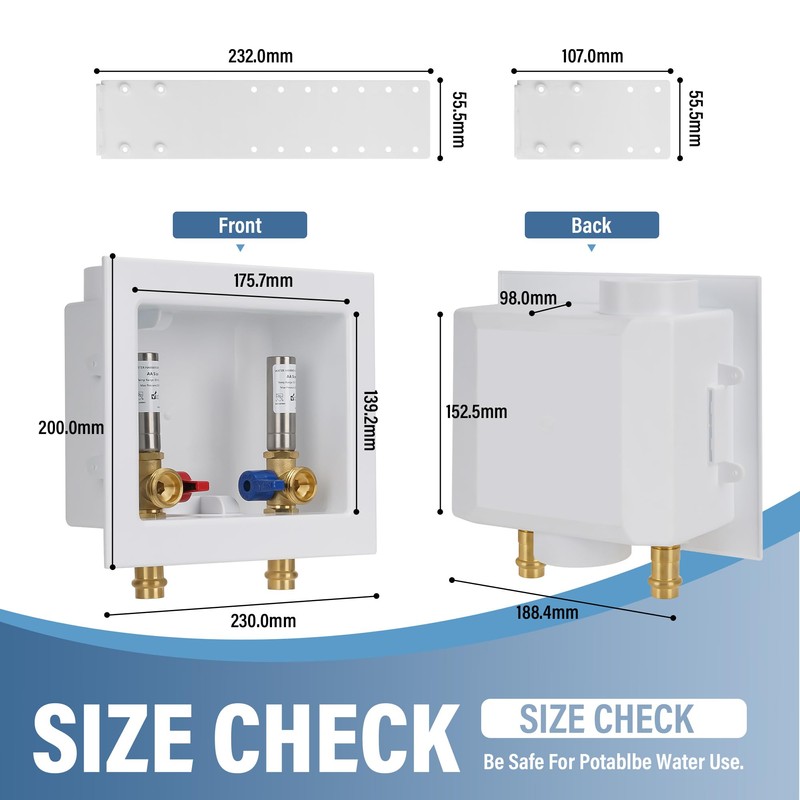 - Pipe Compatibility: The inlets of washing machine box work well with 1/2 inch copper pipes; the outlets fit well with 3/4 inch MHT washing machine hoses.