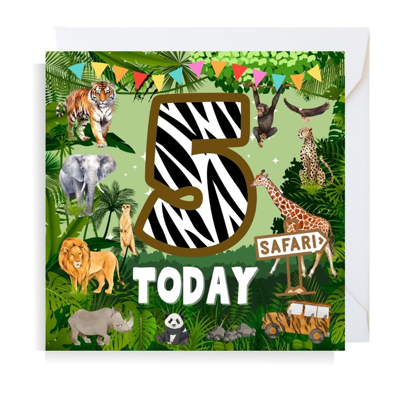 Second Ave Safari Jungle Animal 5th Birthday Age 5 Square Children's Kids Birthday Greeting Card for Boy or Girl