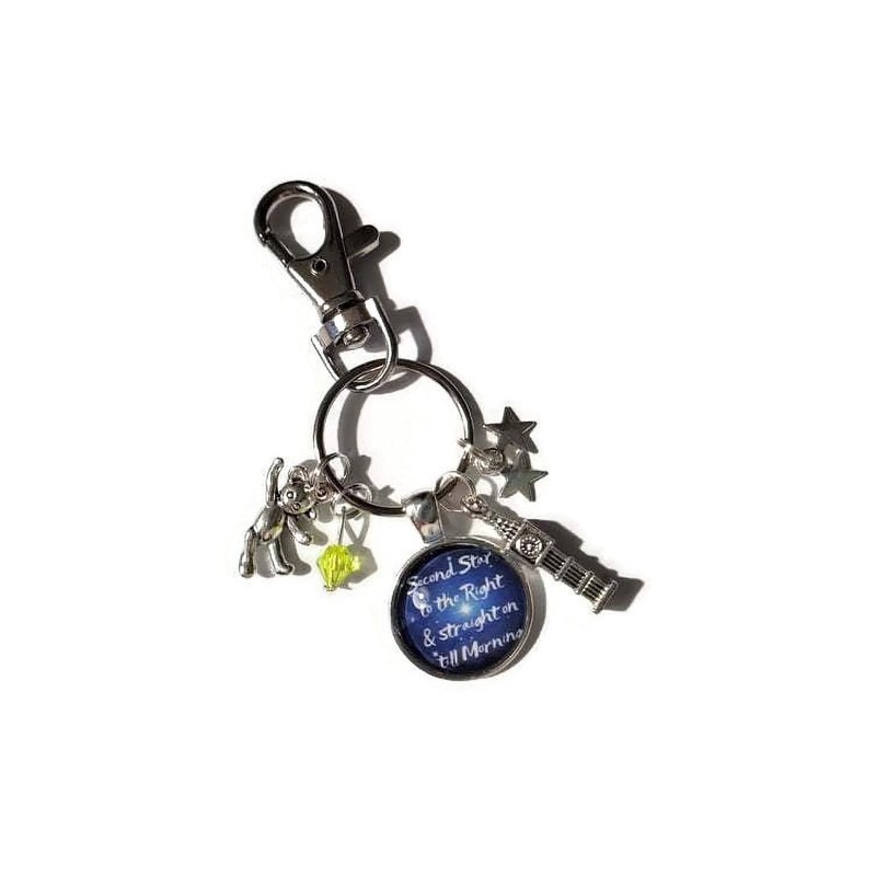 - 20mm glass cabochon " second star to the right & straight on till morning " attached to a 25mm keyring & small lobster bag clip