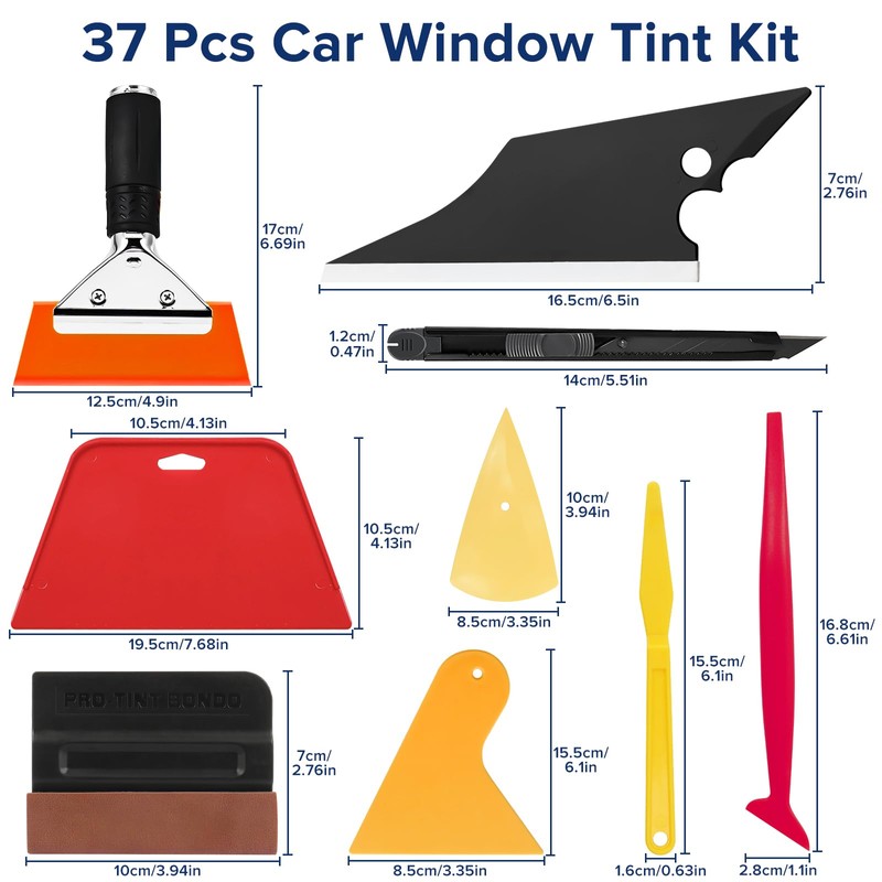 - 37 Pcs Car Window Tint Kit - Car window film application tool kit includes 37 professional components, covering various types of scrapers and squeegees, four pieces of black velvet cloth, two craft knives, 5+10 spare blades, two magnet holders, and two pairs of gloves. Whether it's car window film application or vinyl wrapping, this one kit covers all steps.