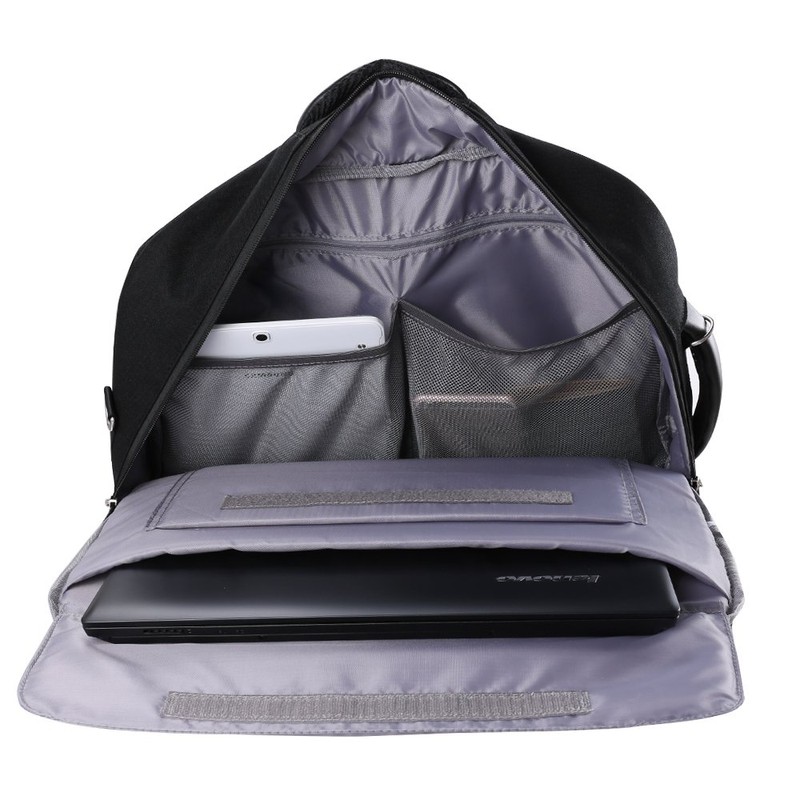 Large and spacious main compartment is so well organized. It has a laptop sleeve pocket, a tablet pocket, two mesh pokcets for wallet, phone, chargers and a side zippered pocket for cash or notes. It is secured with dual zipper closure.