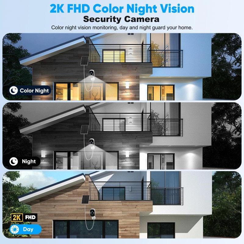 2K solar security cameras wireless outdoor, solar powered cameras for home security, solar camera outdoor wireless, 2.4GHz wifi, color night vision, two-way talk, PIR motion detection, IP66 waterproof, cloud storage/SD card, two spotlight