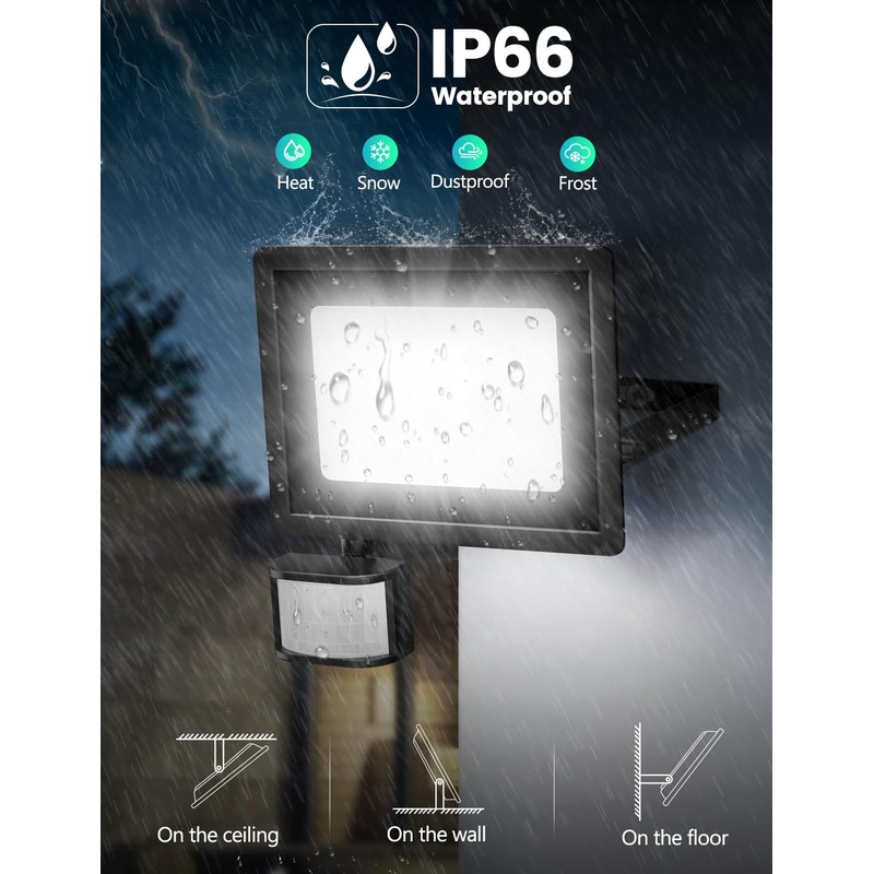 - 【IP66 Waterproof】-The motion sensor lights outdoor with full seal protection design adopts IP66 waterproof technology, heat resistant, frost resistant, and capable to resist all extreme weather conditions, ensuring durability and reliable performance even in rainy or snowy environments, ideal for outdoor use. The sensor's adjustment button is equipped with a waterproof soft rubber stopper to better prevent rain from seeping in.