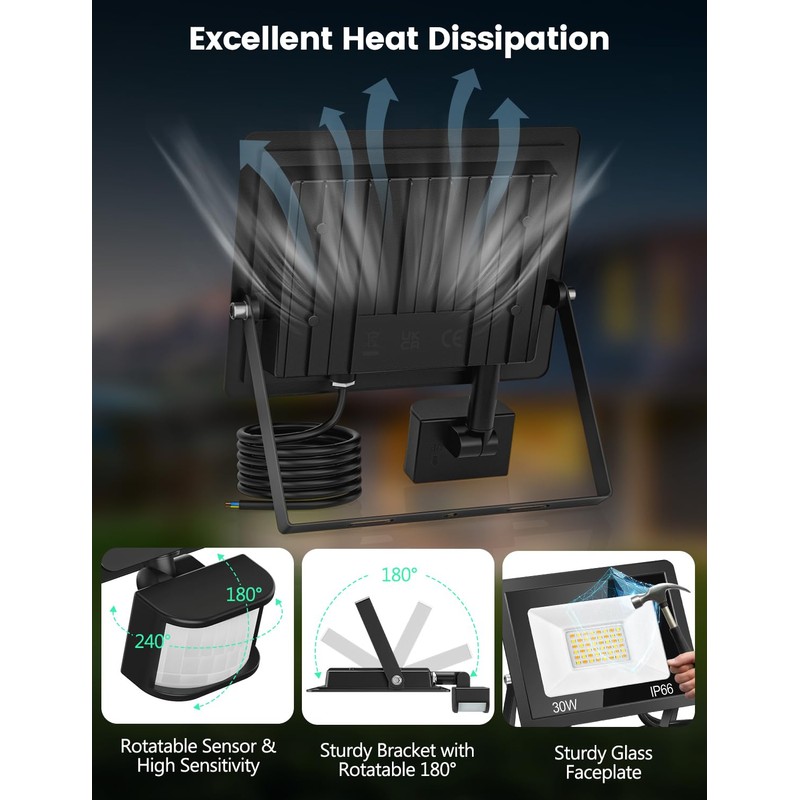 - 【Durable & Energy Saving】-The 30W security light mains powered can replace an old style halogen spotlight that was 400 watts, saving more than 80% of power, saving money on your electric bill. The outside lights are constructed from die-cast aluminum material and tempered glass, Aluminum alloy shell brings good heat dissipation performance and corrosion resistance, which makes it more durable, with a service life of up to 50,000 hours.