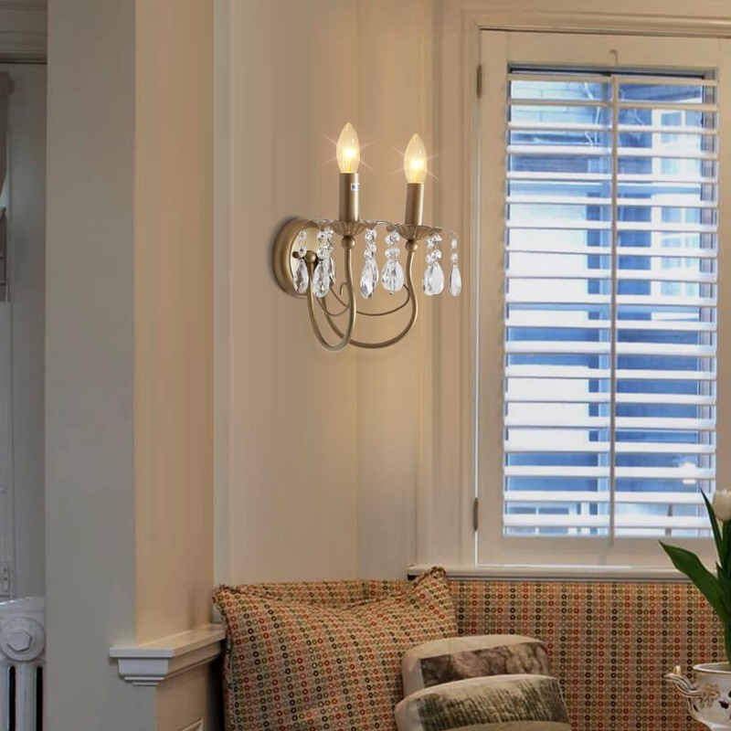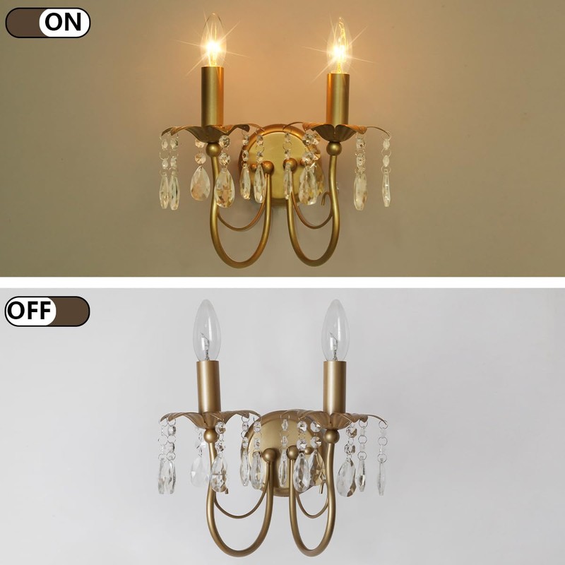 - [Unique Design] This 2-Light crystal wall sconce adopts candlestick shape and combines with sparkling crystals, which adds an elegant look to this wall sconce, making it more attractive and presenting an elegant ambient effect for your home.