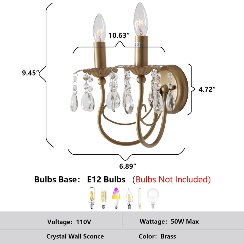 - [Product Specification ] This brass wall lighting with crystal the size of 10.24" x 9.84" x 7.87". Bulb Type: E12 x 2 (Bulbs Not included), Max. 50W, the following kind of bulbs are compatible with the lamp: Dimmable Bulbs, Energy Saving Bulbs, Led Bulb, Halogen Bulbs etc. You can choose different style bulbs and color temperatures to create multiple atmospheres to your house.