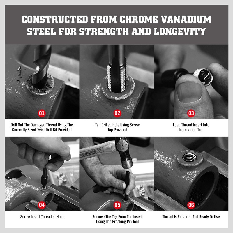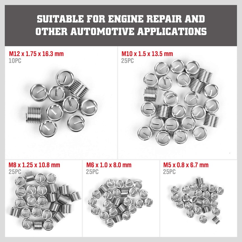 - CONVENIENT STORAGE - Take your organized set wherever you go. The entire thread repair kit comes in a durable steel carrying case, making tool transport and storage a breeze, right down to the last rethread stripped wrench.
