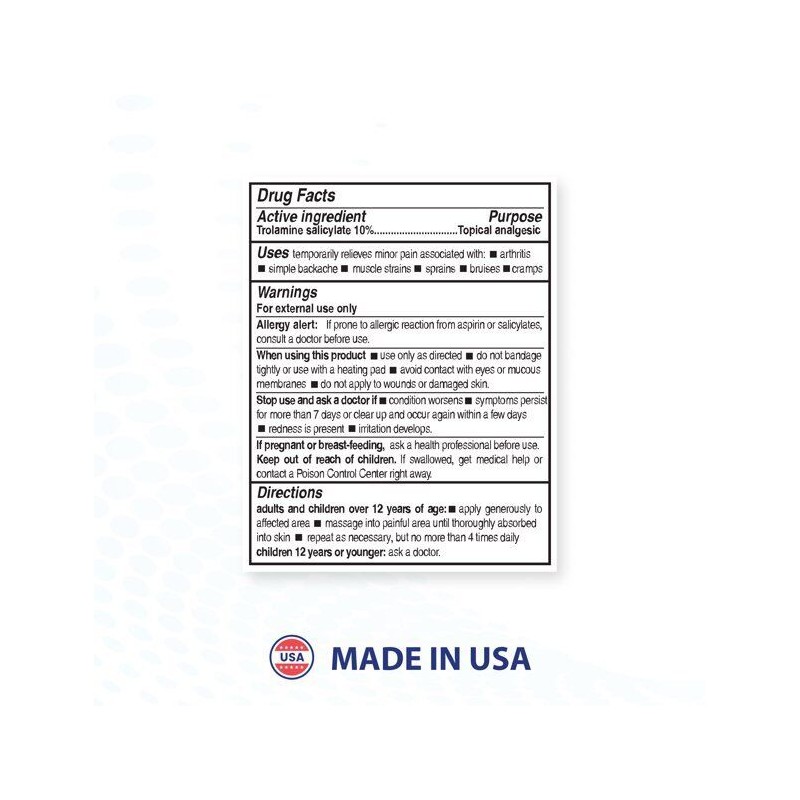 Temporarily relieves minor pain associated with: arthritis, simple backache, muscle strains, sprains, bruises, and cramps. Deep penetrating, long lasting, and odor free. With Emu Oil and Aloe.Active Ingredients: Trolamine Salicylate 10%