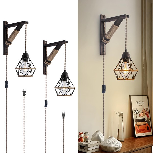 SEEBLEN Plug in Wall Light Sconce Set of 2,Farmhouse Wall Lamp with Plug in Cord On/Off Switch,Industrial Lamp with Metal Cage for Bedroom Headboard Living Room.