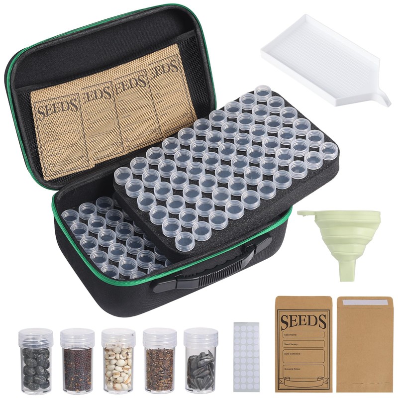 - Practical Seed Tools: Seed organizer set includes a black portable carrying organizer bag, a sufficient number of small clear bottles, a sufficient number of labels, 20 seed envelopes, green funnel, white tray. Labels are used to label plant names; seed envelopes organize larger, flat seeds; funnels quickly dispense large quantities of seeds; white trays efficiently sort through mixed-up seeds. Seeds not included.