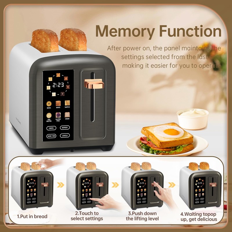 - Advanced Touch Screen: Features a real color LCD touch screen for precise control, allowing you to easily adjust shade setting, bread type by a touch. Every icon and function key can be touched. The 1350W make 50% faster heating speed for quick, efficient toasting.