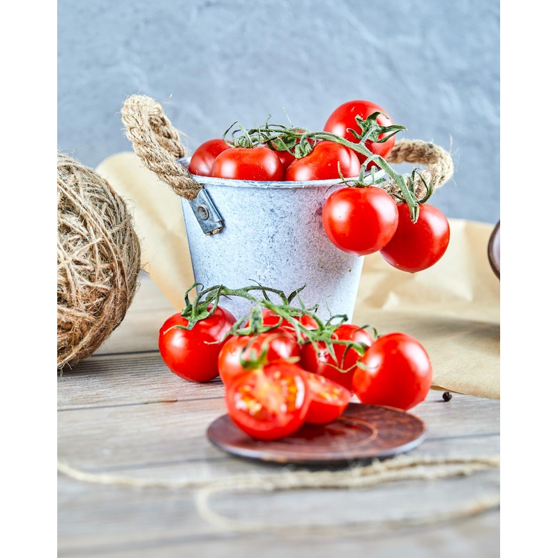 An indoor cherry tomato plant that grows up to 12-16 inches tall. Before planting, soak seeds in room temperature water for 24 hours. Plant seeds in a pot filled with seed-starter potting mix ¼-inch deep. Keep the soil moist, but not soggy, and never let it dry out. Keep the pot covered with a plastic lid or plastic wrap until germination. The best daytime temperature is 75-80°F. Once sprouted, move the plants to a place with full sun. Once the plants are about 3 inches tall, transplant them into larger containers or a 6-inch pot. Water well.