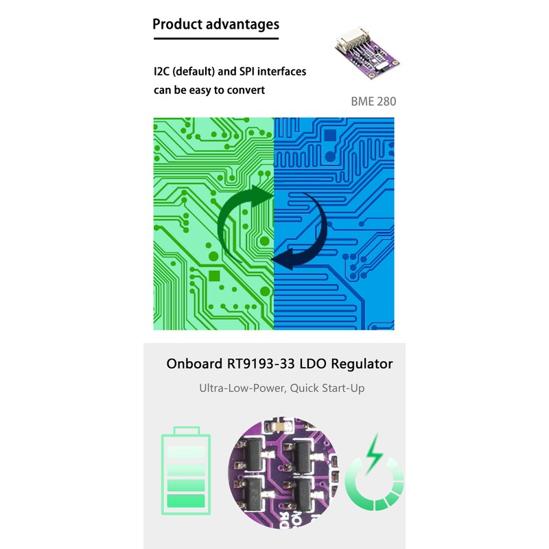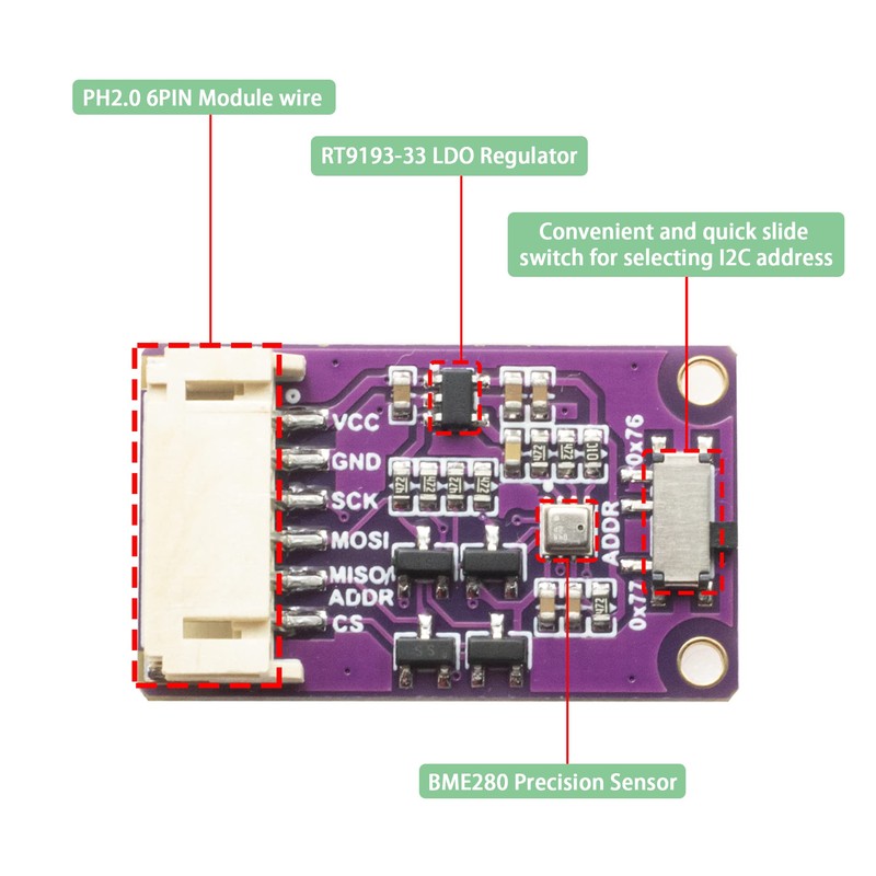 - Temperature sensing: -40~85°C (resolution 0.01°C, accuracy ±1°C); humidity sensing: 0~100%RH (resolution 0.008%RH, accuracy ±3%RH); barometric pressure sensing: 300~1100hPa (resolution 0.18Pa, accuracy ±1hPa)