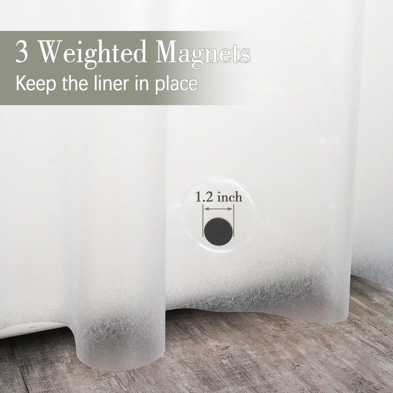 - 【Heavy Duty & 3 Large Magnets】This 72x74 translucent shower liner features 3 large magnets at bottom, which can weight the curtain for better hanging, keeping in place and prevent it from billowing. This feature can help you maintain a dry and wet separation in the bathroom.