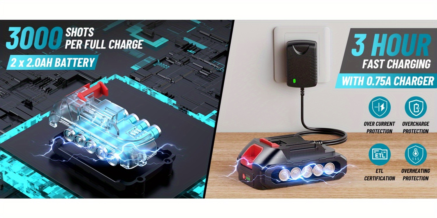 Cordless Freedom: Say goodbye to compressors, hoses, and costly gas cartridges with the Seesii cordless nail gun. This cordless nail gun is powered entirely by batteries, allowing you to work anywhere with ease—driving up to 3000 brad nails on a single charge.