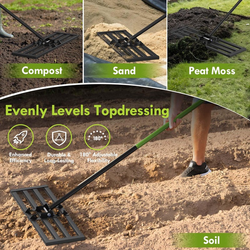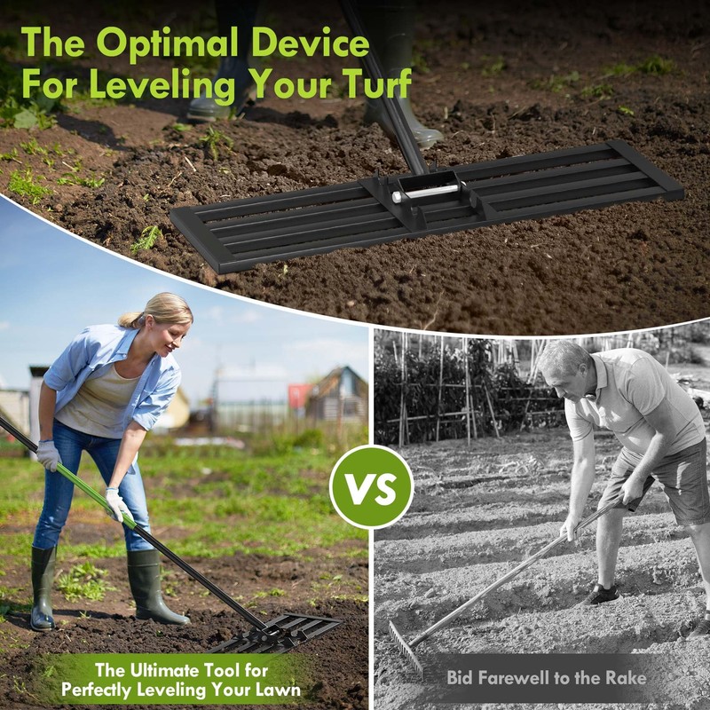 - Square Tube Design – No Dirt Accumulation: The lawn leveling rake is entirely made of square tubes, which, compared to grooved designs, prevents dirt from accumulating. Additionally, the smooth bottom surface enhances ease of pushing and pulling. Using our leveling rake makes achieving a perfectly level lawn effortless! It helps you spread topsoil, tidy up your yard, or distribute fertilizer. The rake also features a slot for convenient storage of the handle rod, making it more practical