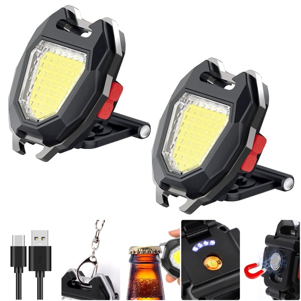 SEFONE 7 Modes COB Keychain Work Light 2 Pack, 1200 Lumens Bright Rechargeable LED Flashlight, Portable Pocket Light with Folding Bracket Whistle Lighter Magnet for Outdoor