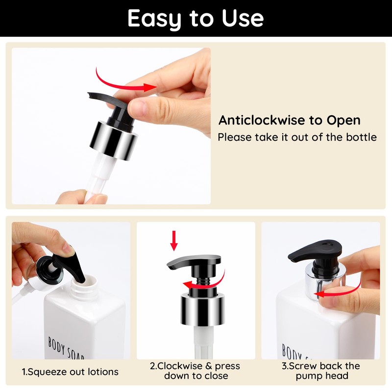 - Easy to use: Turn the pump head counterclockwise to open and use. Press the pump head down and turn it clockwise to close it and avoid leakage of the emulsion.