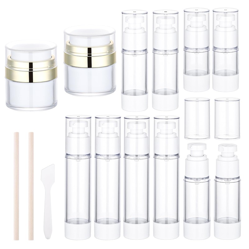 • 12 Packs Set: 6pcs set of 0.5oz/15ml 1oz/30ml 1.7oz/50ml airless lotion bottles; 2pcs 0.5oz/15ml airless pump jars; 4pcs set of 1oz/30ml 1.7oz/50ml airless fine mist spray bottles. To fill lotion BELOW the line level of the screw thread to avoid overflow