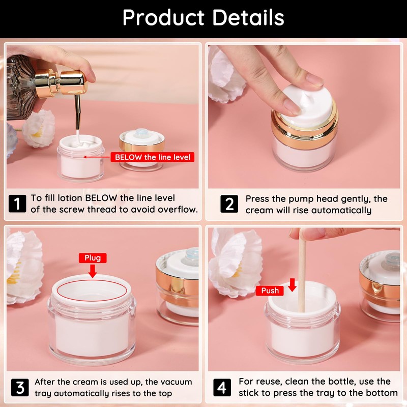• Reusable & Every Drop for Less Waste: These airless bottles can be cleaned easily and reused when product is used up. The vacuum pump ensures every last drop is dispensed for less waste, which can fully utilize your skincare product