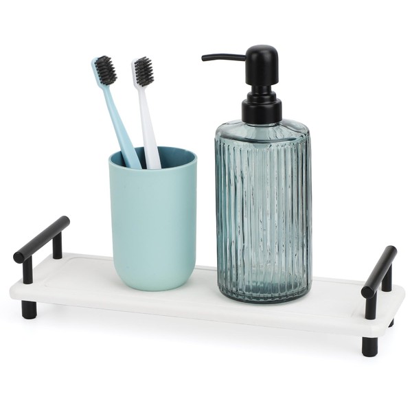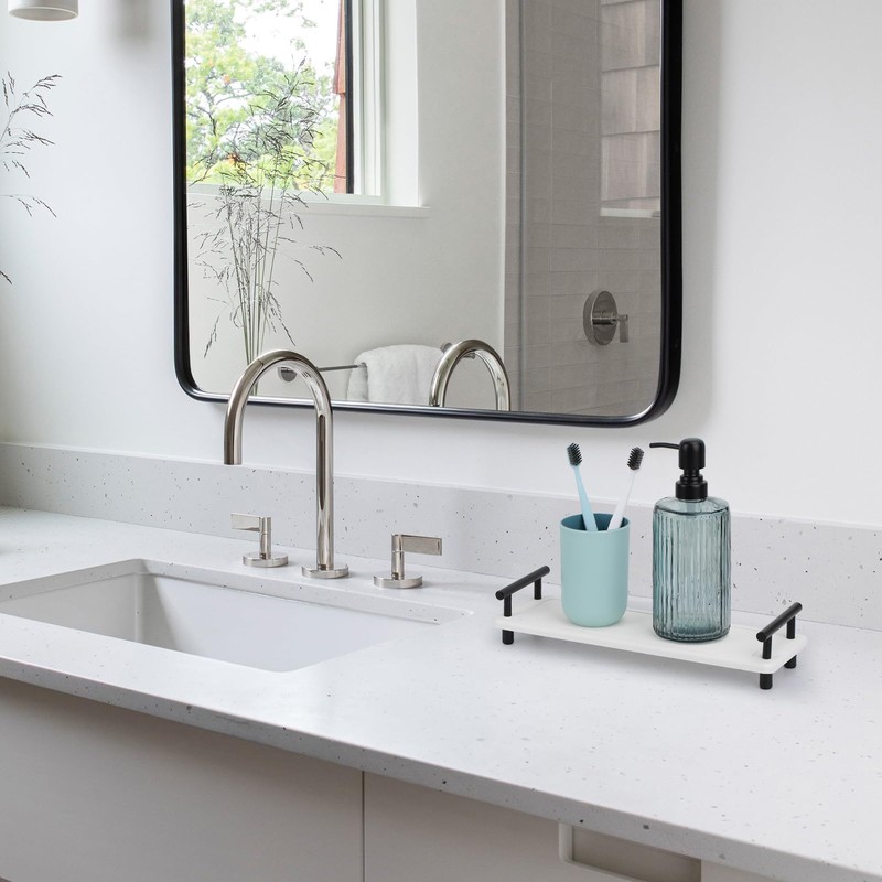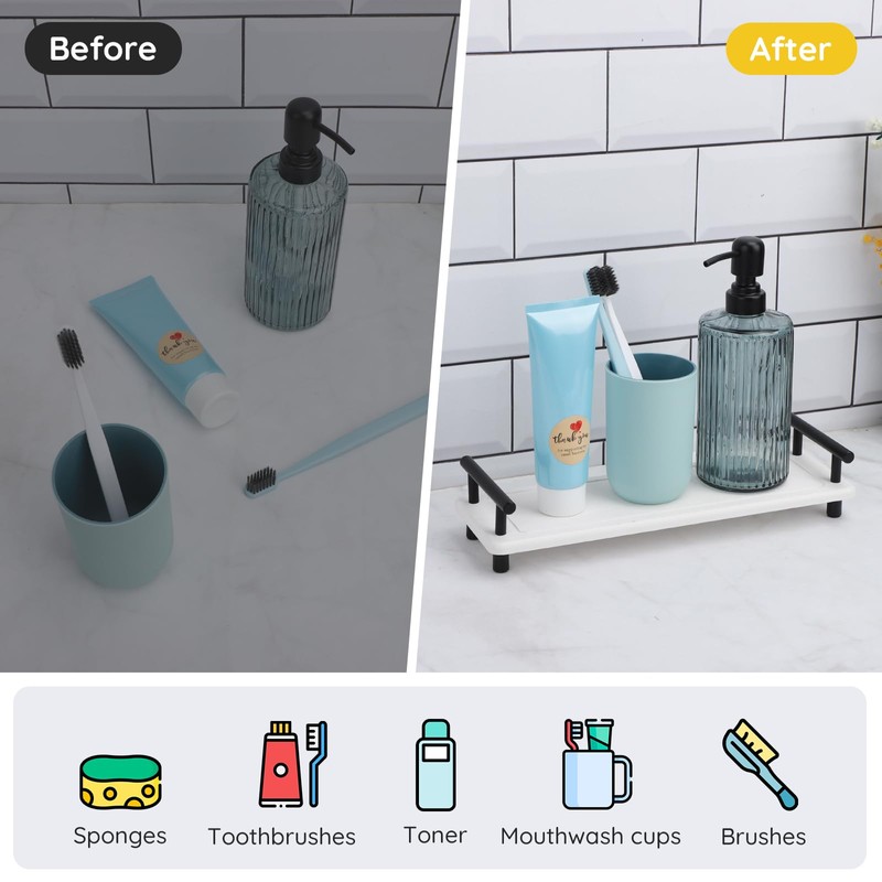 - Beautiful and tidy: you can place soap dispensers, soap, toothbrushes, toothpaste, facial cleanser, razors, sponges and other items on this tray to make the worktop more orderly and beautiful. At the same time, this tray is relatively small and does not take up too much space on the countertop.