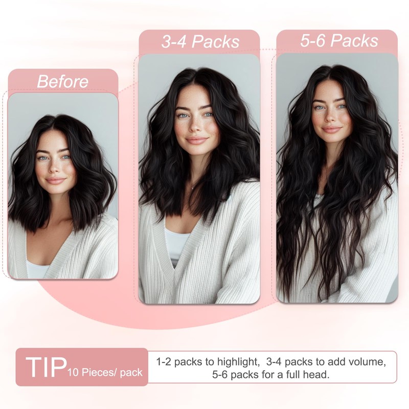 - SEGO real hair tape specification: 1-1.5 g per piece, 10 pieces per pack, total 10-15 g per pack. (Tip: 5 or 6 packs for a full head)