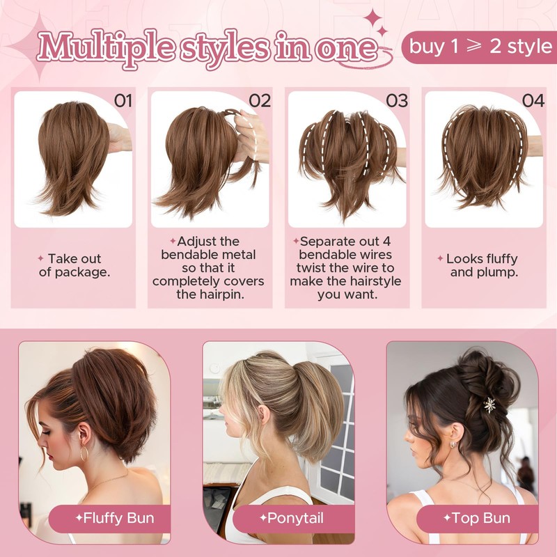 - DIY Bendable Styling: Shape your look freely with 4 adjustable aluminum wires in this claw clip ponytail extension. Perfect for creating messy bun hair piece or a sleek ponytail wig – bend, twist, and secure your ideal updo in seconds.