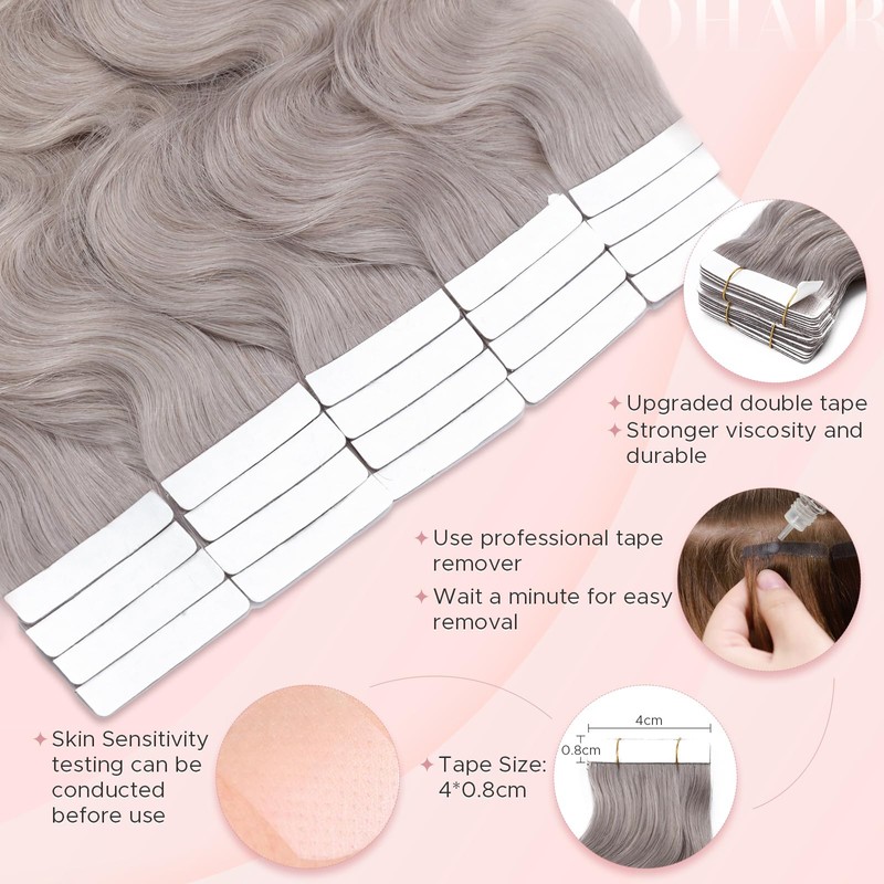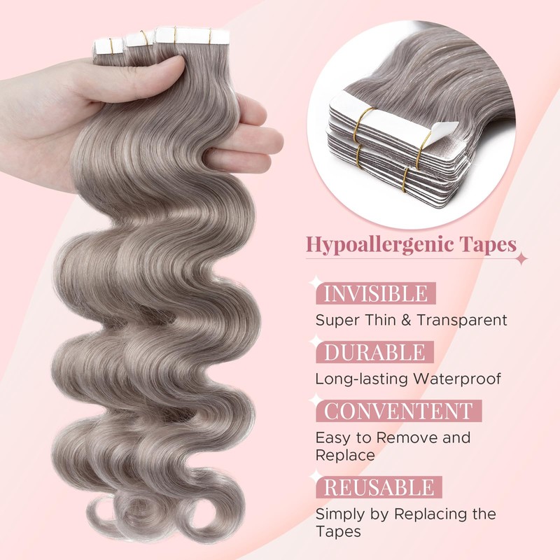 SEGOHAIR Wavy Tape In Hair Extensions Real Human Hair with Double-Sided Adhesive Professional Hair Extensions for Women 20pcs Body Wave 14 Inches Grey