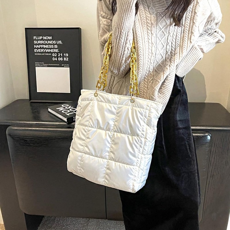 Segreto Women's Lattic Cotton Lattic Handbag Padded Quilted Chain Shoulder Bags Down Shoulder Bag Trending Bags, Pearl White