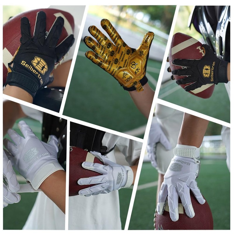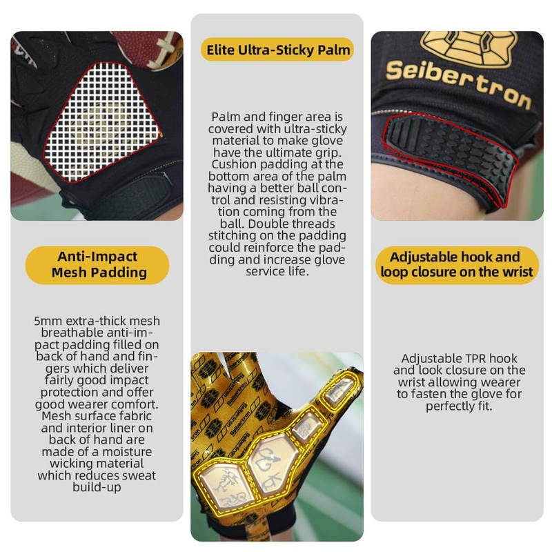 Seibertron H.P.I.L.G Touchscreen Lineman and Football Receiver Gloves, Flexible Breathable Impact Protection Back of Hand Glove Adult Black XL