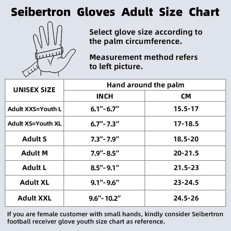 - Method for choosing the size,According to palm circumference not including thumb, Adult XXS=Youth L(6.1"-6.7",15.5cm-17cm) Adult XS=Youth XL(6.7"-7.3",17cm-18.5cm)