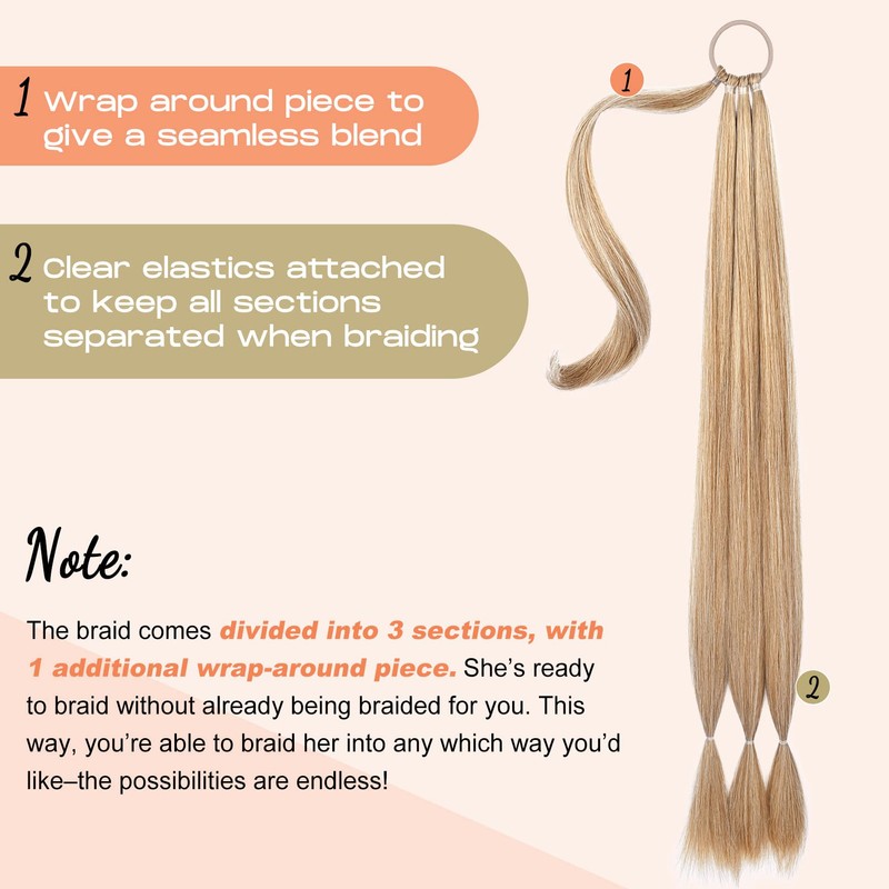 - How to Apply - 1.Tie your hair into a ponytail. Then, tie the braided ponytail around your pony. 2.Separate shorter synthetic hair piece from longer ones. Split your hair into 3 sections and braid it with the synthetic hair. 3.Secure braid with clear elastic & wrap the hair piece around. 4.Secure it with bobby pins