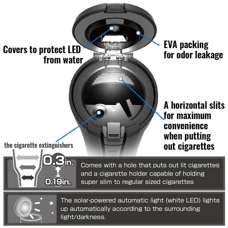 - The "Full Open Strain" feature allows the lid to be opened wide for the extinguishing area, making it easy to throw away the butt