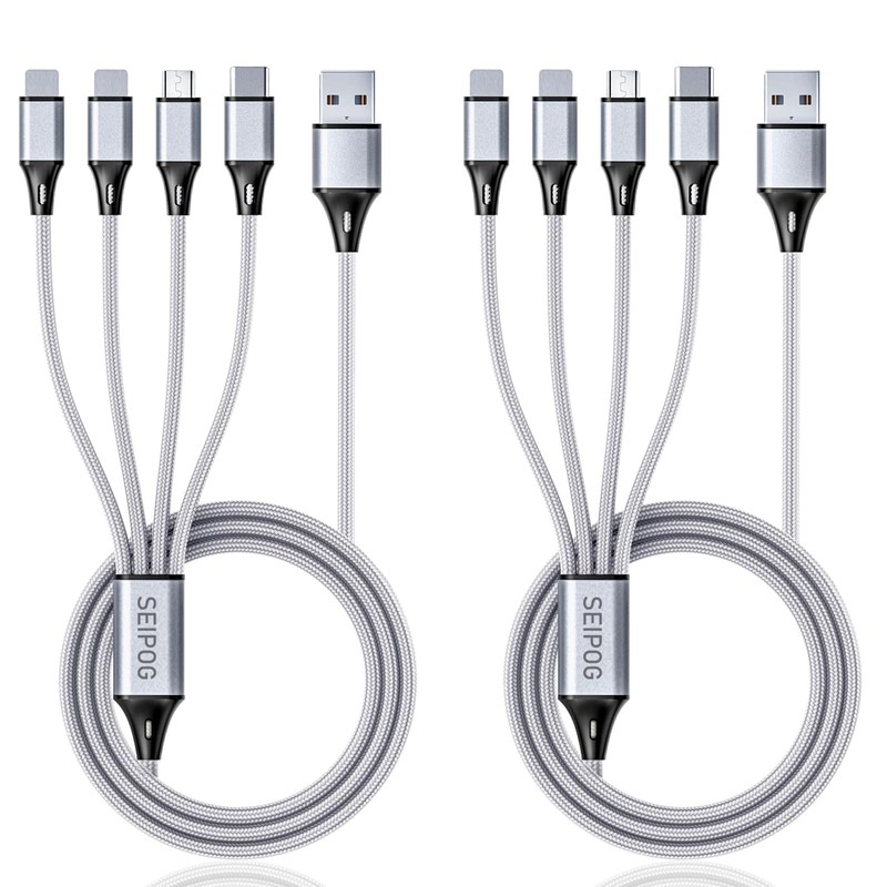 Multi Charging Cable, USB Cable 3A 4FT Nylon Braided Universal 4in1 Charger Adapter Type-C/Micro Port, Compatible with Cell Phones and More (Silver, 2Pack)