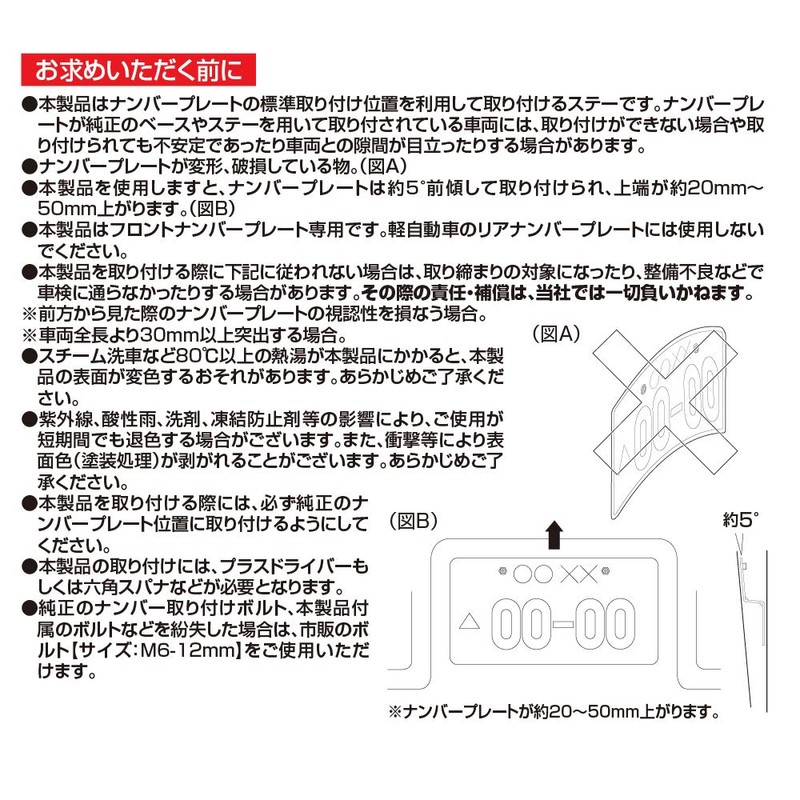 - (Approx. 5° Slant Front Only) The license plate can be adjusted 5°, and can be moved up to 2.0 inches (50 mm) up and installed. Height adjustment: Approx. 0.8 - 2.0 inches (20 - 5