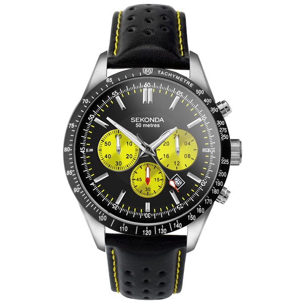 - QUALITY MATERIALS This watch fastens with a black leather strap with yellow stitching; the watch has a round, stainless steel case and a black dial with yellow sub dials; features include 1 second chronograph timing up to 1 hour, 24 hour read out, a date display and up to 50 metres water resistance