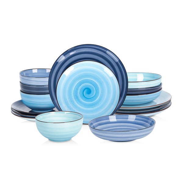 Selamica Ceramic 16-Pieces Dinnerware Set, Ceramic Dishes Set for 4, Kitchen Plates and Bowls Sets, Dinner Plates Set, Spray Black Dots, Gradient Blue