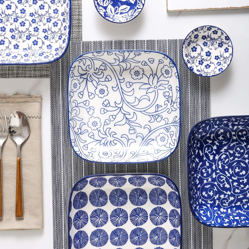 Selamica Porcelain 8-inch Square Dinner Plates, Salad Pasta Bowls, Set of 6, Vintage Blue