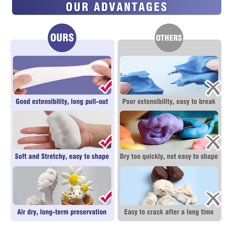 - 【SAFE & NON-TOXIC】 Made of safe and non-toxic clean materials, and it is certificated by ASTM/EN71. It's safety for children and adults, you can use the air clay with confidence. 500g net weight, enough for a perfect work. Notes: Unused clay needs to be stored sealed to ensure its use effect!
