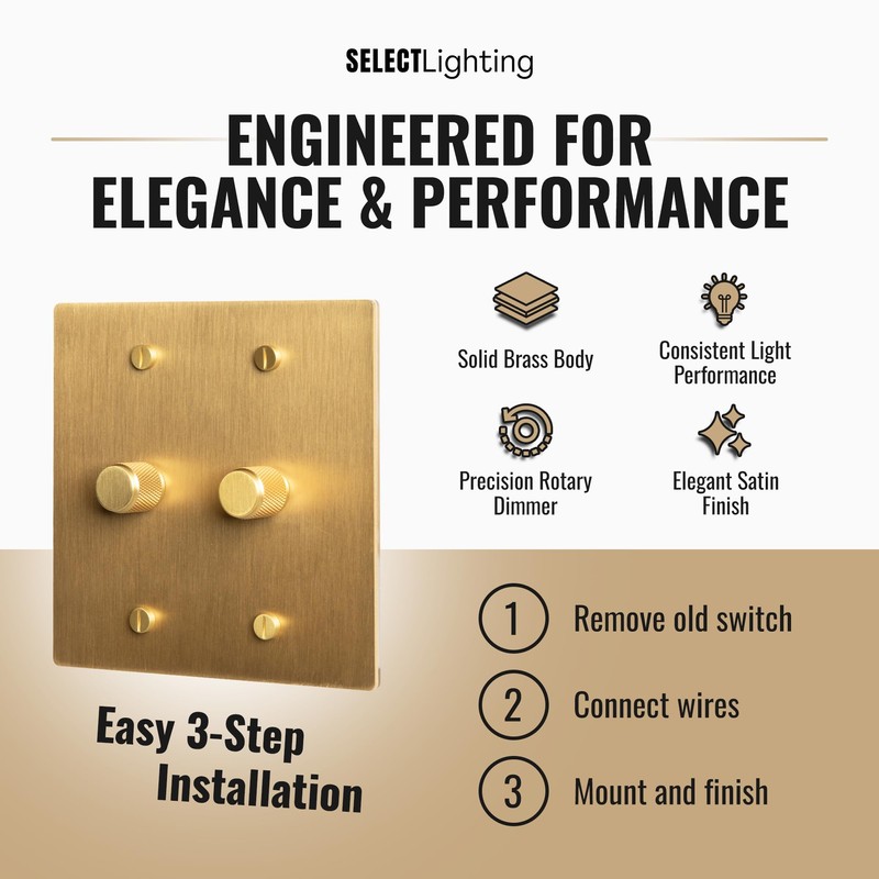 SELECT Lighting 2-Gang Satin Solid Brass Rotary Dimmer Switch, 15A 120V AC Wall Mount, TRIAC/Leading Edge 1-Way Compatible, Dimmable LED Light Control with Knob, Faceplate & Dimming Module