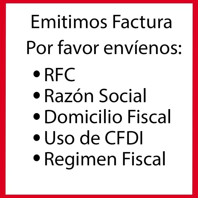 **Emitimos factura, por favor envíenos RFC, razón social, domicilio fiscal, uso de cfdi y regimen fiscal.**