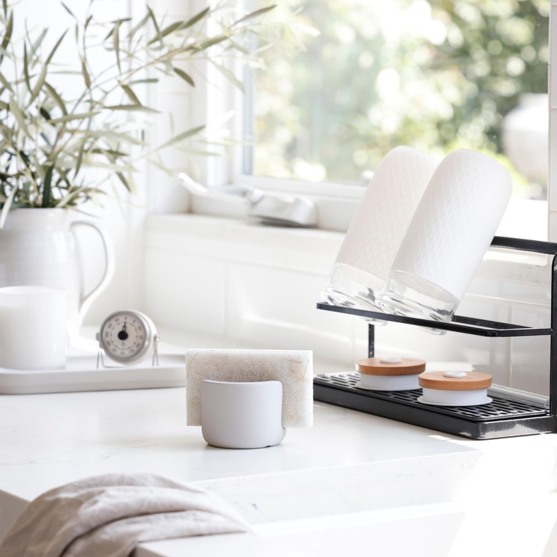 - UNIQUE AND STYLISH DESIGN: Enhance Your Kitchen Decor with the Modern and Elegant Diatomite Stone Sponge Holder, Adding a Touch of Sophistication to Your Sink Area. Perfect kitchen sink organizer for farmhouse and modern-style kitchens.