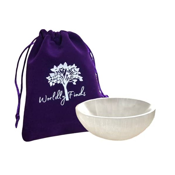 - GIFT READY - GIFT BAG INCLUDED! Each selenite bowl is gift ready and comes in a purple velvet gift bag (shown), convenient for storage when not in use or for storing small crystals. Packaged extremely securely to protect this fragile stone with lots of love by a small family business. Exclusively designed by Worldly Finds. Note - Selenite is not to be exposed to water as it is gypsum and is a very soft mineral.