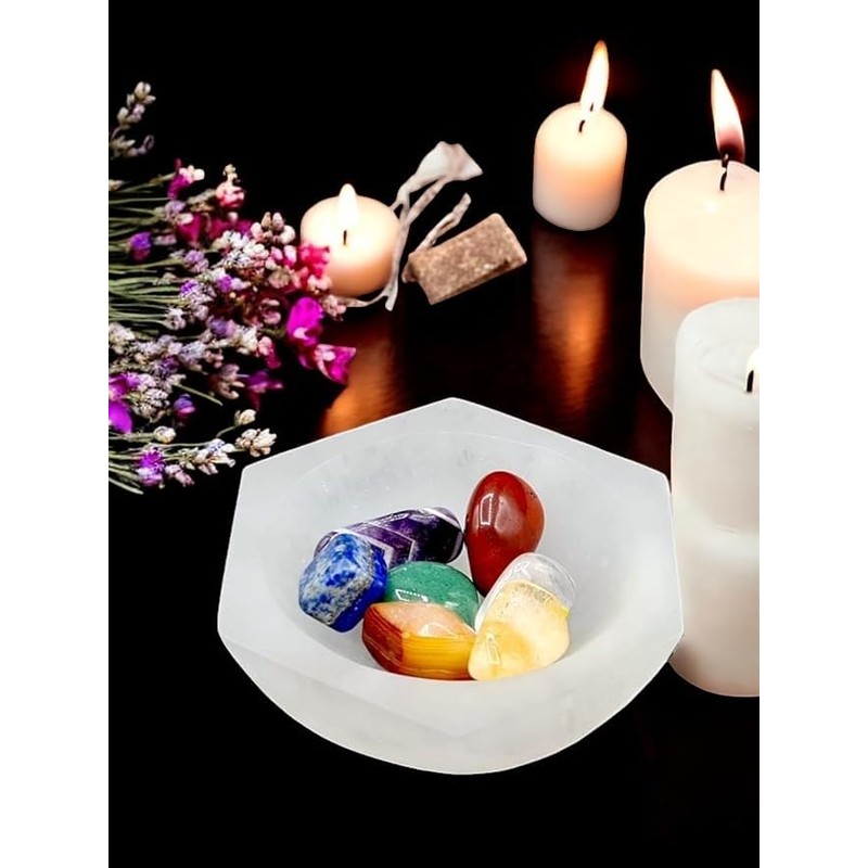 - selenite crystal bowl designed for both spiritual and decorative use. Known for its ability to open the crown and higher crown chakras.